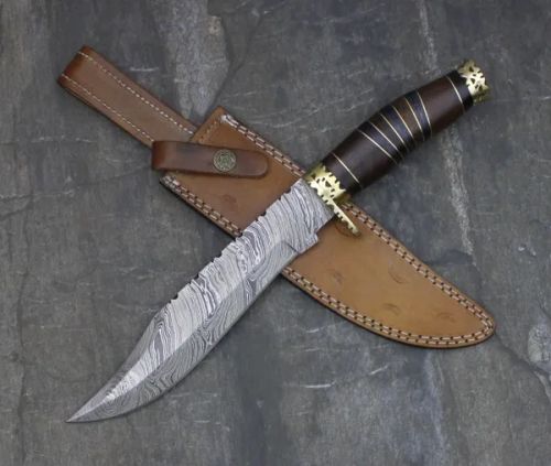 Our Damascus Steel Custom Handmade Hunting Bowie knives are engineered for superior hand control, agility, and comfort. This knife is a must-have for any Hunter, Outdoorsman, and Collector! It’s a multi-function knife and it can be used for outdoor survival, hunting, camping, and hiking, and good for collection. Our high-end blades are hand-forged Damascus steel; pattern-welded in-house combining 1095 tool steel and 15N20 nickel tool steel. The hardness of this Damascus blade is rated at 55 to 58 HRC on the Rockwell scale which holds the sharpness for a long time. This hand-ground blade has heft and comfortable handling made for practical use. Our Canadian knife makers are the leading producers of carbon Damascus steel in the world. Our unique small production, the customs process allows us to make the finest handmade knives in Canada and purchased worldwide at a fantastic price. Each knife undergoes strict quality control to ensure the flawless craftsmanship that Grizzly Blades has become known for. The entire knife is handmade at our facility from forging the Damascus billet to stitching the custom-fitted quality leather sheath with a vertical carry belt loop for easy fastening.